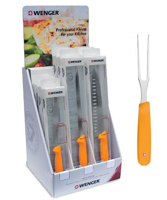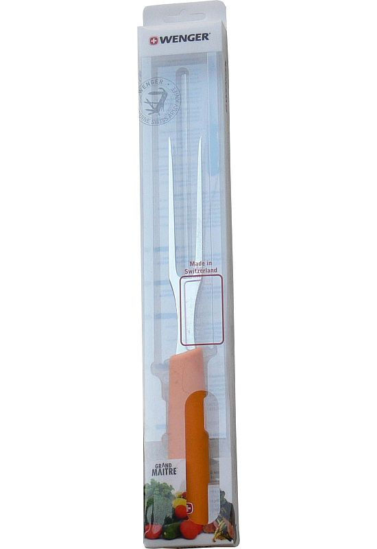 žlutá vidlice na maso s vidlicemi o délce 15 cm a oblou dobře uchopitelnou střenkou z odolného polyamidu v dárkovém balení z produkce švýcarské značky Wenger