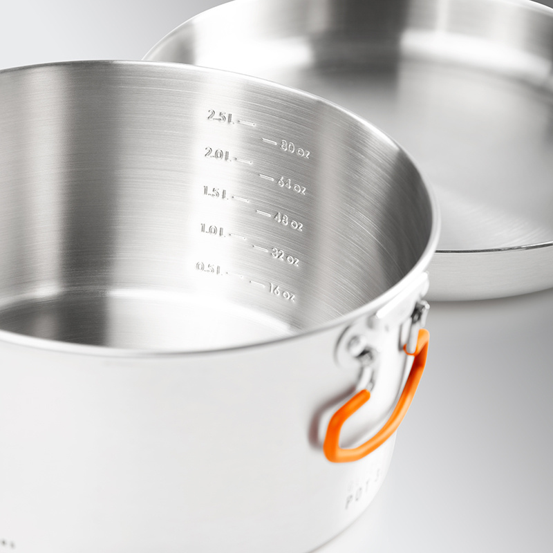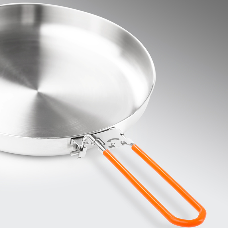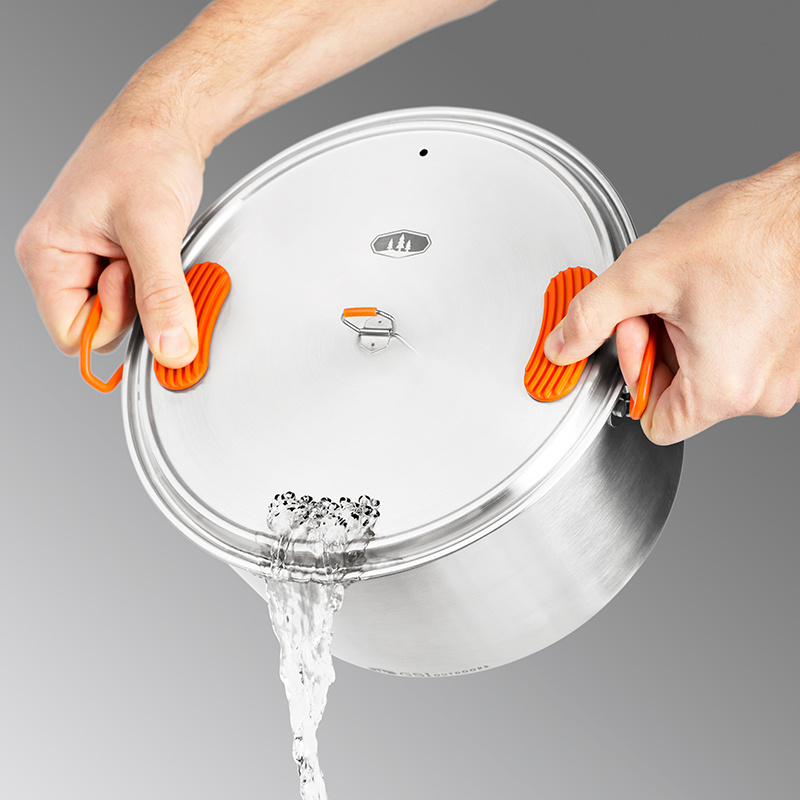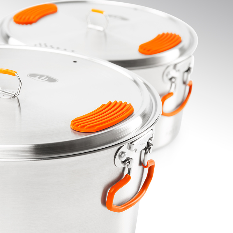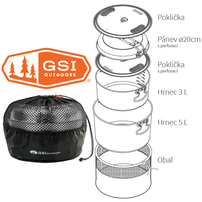 Kempovací nerezová sada 2 hrnců 3L + 5L a pánve pro 4 a více osob. Perforované pokličky umožňují bezproblémový únik par z hrnce a zároveň slouží jako sítko například pro slití vody z těstovin. Navíc má poklička silikonové chrániče na palce pro jednoduchou a bezpečnou manipulaci. Sada nádobí GSI Glacier Base Camper Large je vyrobena z prvotřídní odolné nerezové oceli.