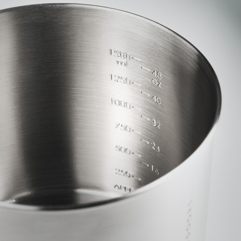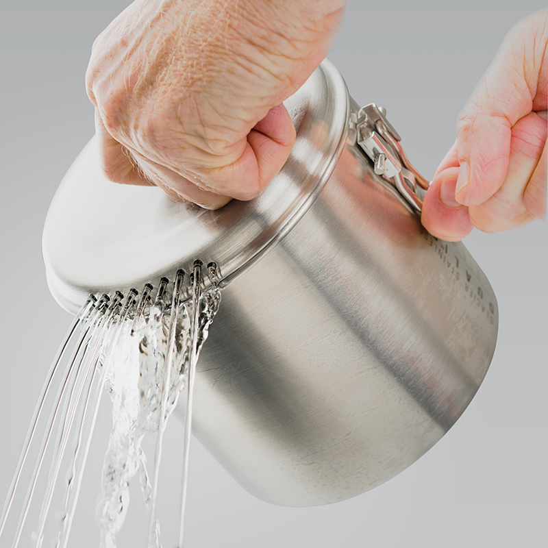 Z dalších výhod této kompaktní sady rozhodně oceníte vyraženou vnitřní stupnici objemu na rendlíku nebo sklápěcí rukojeť, která po sestavení slouží jako zámek celé sady.