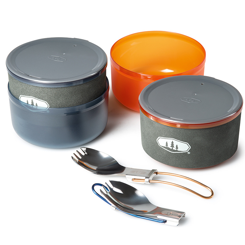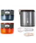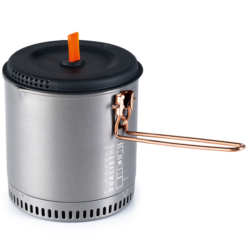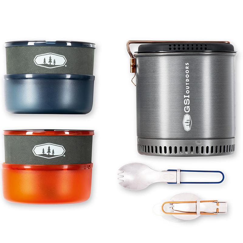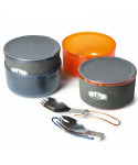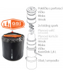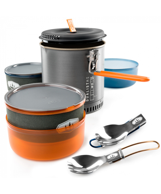 Halulite Dualist HS je sada nádobí pro 2 osoby s hlavním 1,8l rendlíkem z tvrdě eloxovaného hliníku. Na spodní části rendlíku je hliníkové žebrování - tepelný výměník, který zkracuje dobu ohřevu o 30% a zároveň šetří plyn. Součástí sady jsou 2 misky, 2 hrnky s děrovaným víkem pro pití, 2 skládací lžícovidličky, perforovaná poklička pro scezení vody a obal na celou sadu, který slouží jako nádoba na vodu nebo umyvadlo. Celá sada se dá do hlavního rendlíku složit tak šikovně, že zbyde místo i pro plynovou kartuši GSI Isobutane Fuel 230g a plynový vařič GSI Pinnacle Canister Stove, které však nejsou součástí sady.