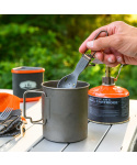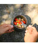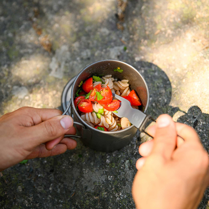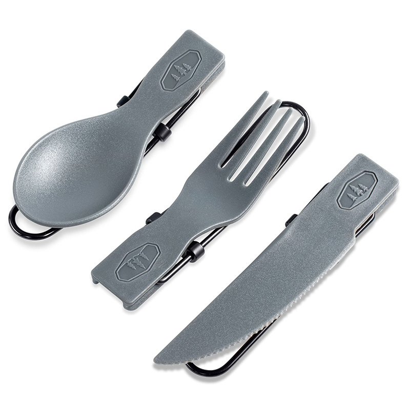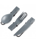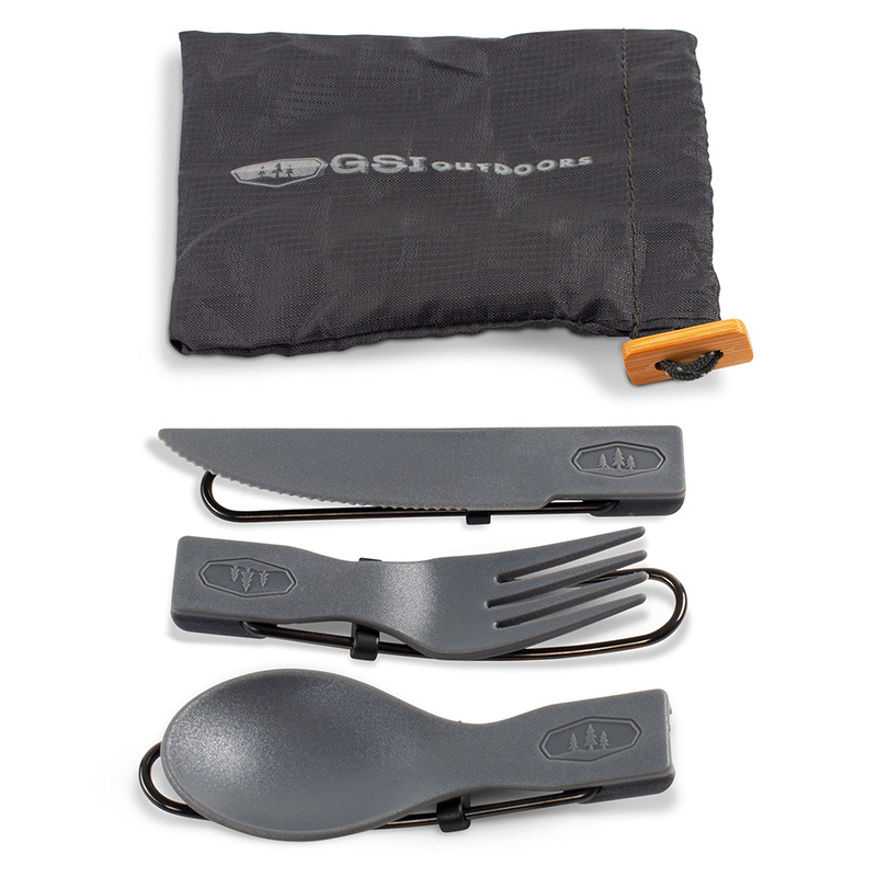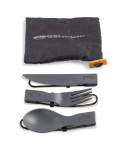 Campingový příborový set skládací lžíce, vidličky a nože s uzamykatelnými rukojeťmi z nerezové oceli. Díky sklopné rukojeti můžete tento set uložit do jakékoliv misky GSI a mít tak příbor hned ruce bez dlouhého pátrání. Plná velikost vyhovuje i pro použití v rukavicích. Součástí setu je i stylový transportní sáček pro snadnou přepravu.