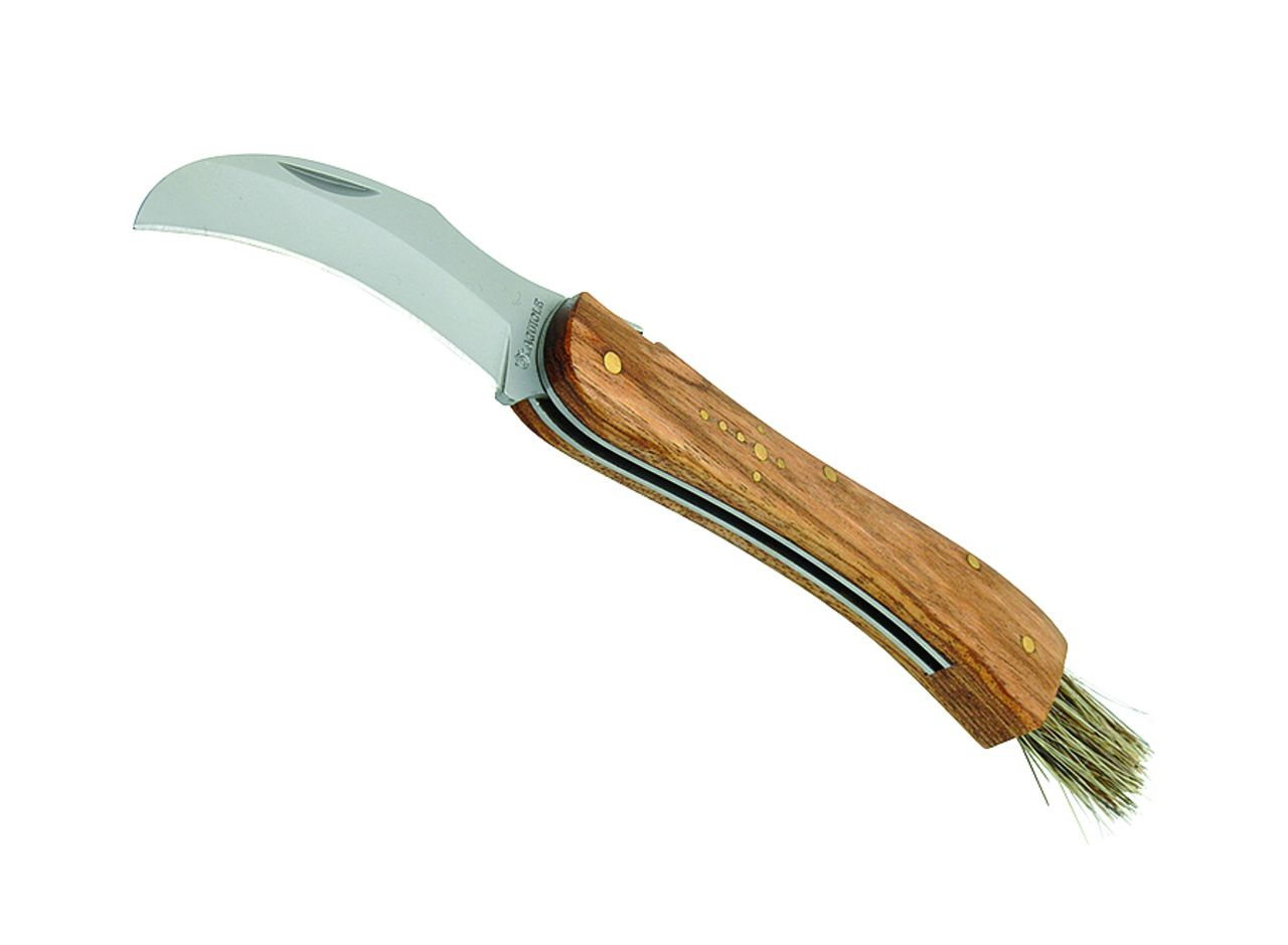 <p>Skládací houbařský nůž vybavený bezpečnostní pojistkou a štětinami na očištění hub. Dodáván