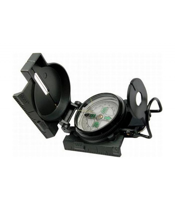 ženijní zaměřovací buzola typu Ranger s korpusem z tmavé eloxované aluzinkové slitiny, střelkou uloženou v kapalině, měřítkem a kovovým poutkem
