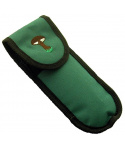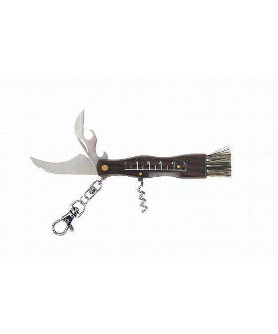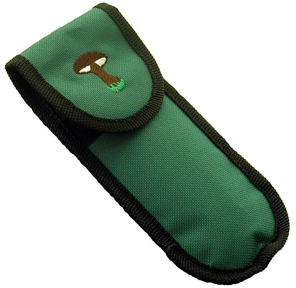 menší houbařský nůž 55mm se štětečkem na čištění hub a měřítkem, otvírákem a vývrtkou, uložený v zeleném pouzdru s vyšitou houbičkou