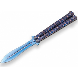 nůž typu motýlek s ornamentálním vzorem barevně vzorovaná střenka z aluminia jištěná západkou barevná jednostranně broušená čepel s odlehčovacími otvoryVíce