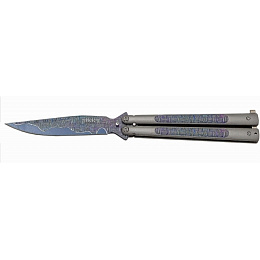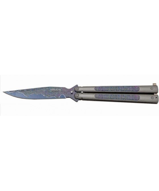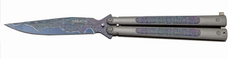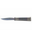 nůž typu motýlek se vzorem fibre střenka z nerezové oceli s matovým povrchem jištěná západkou motiv "fibre" na čepeli