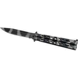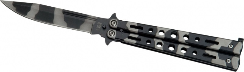 nůž typu motýlek s odlehčovacími otvory na střence střenka z nerezové oceli v černé kamuflážní barvě jištěná západkou maskovaná čepelVíce