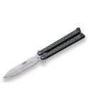 nůž typu motýlek s děrovaným vzorem střenka z uhlíkového vlákna v kombinaci olivová a černá jištěná západkou
