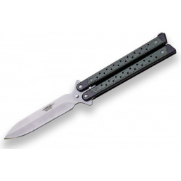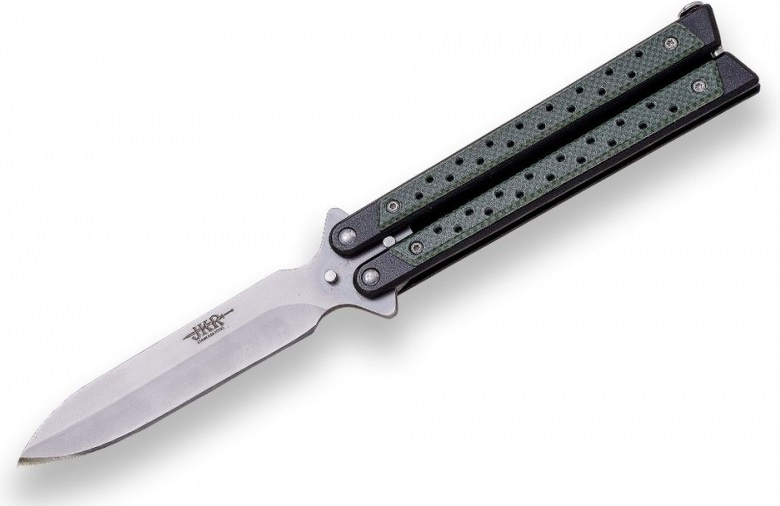 nůž typu motýlek s děrovaným vzorem střenka z uhlíkového vlákna v kombinaci olivová a černá jištěná západkouVíce