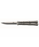 nůž typu motýlek se vzorem bones černá střenka z nerezové oceli jištěná západkou částečně černěná čepel