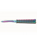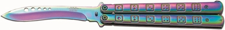 nůž typu motýlek s motivem hracích kostek aluminiová barvená střenka jištěná západkou čepel s odlehčovacími otvory