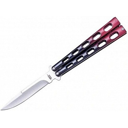 nůž typu motýlek s odlehčovacími otvory na střence střenka z aluminia v kombinaci červená a černá jištěná západkou