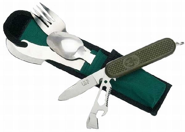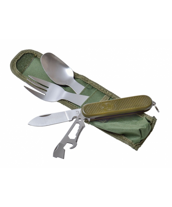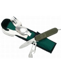 šikovná sada pomůcek v zeleném pouzdru určená pro kempování a obsahující lžíci, nůž, vidličku, otvíráky a škrabku