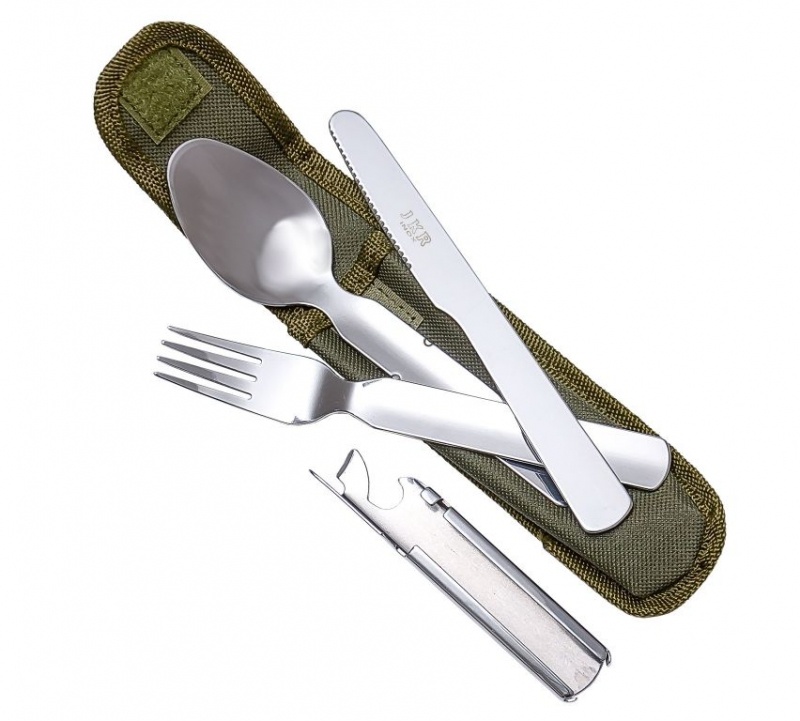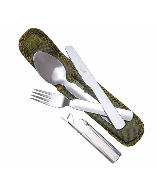 -sada užitečných pomůcek vhodných pro kempování -nerezové provedení v zeleném nylonovém pouzdru -příbory lze pohodlně složit do kompaktního balení -obsahuje lžíci, jídelní nůž, vidličku a otvíráky -nylonové pouzdro na suchý zip je opatřené poutkem na opasek