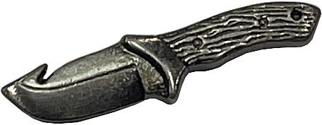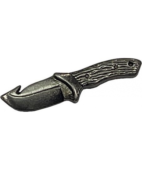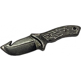 ozdobný pin do klopy s motivem loveckého nože kovový zadní úchyt hrotu špendlíku pro pevnější uchycení do klopy saka, kabátu, košile nebo jiného oděvu originální dárek z kovu se starostříbrným saténovým povrchemVíce