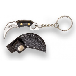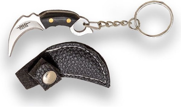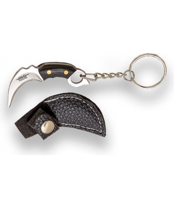 přívěsek na klíče ve tvaru nože karambit s výraznou a tvarově velmi charakteristickou zahnutou čepelí inspirovanou nástrojem původně využívaném v Indonésii dřevěná střenka s nýty závěsné oko koženkové pouzdérko na druk řetízek s kroužkem pro možnost zavěšeníVíce