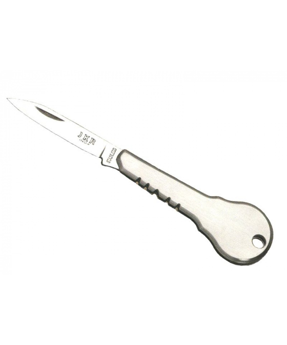 kovový zavírací přívěsek nožík ve tvaru klíče s otvorem pro umístění kroužku na klíče