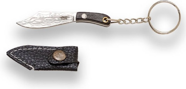 přívěsek na klíče ve tvaru pevného nože s čepelí Kukri v imitaci damaškové oceli dřevěná střenka s nýty závěsný otvor koženkové pouzdérko na druk řetízek s kroužkem pro možnost zavěšení