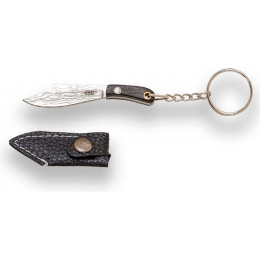 přívěsek na klíče ve tvaru pevného nože s čepelí Kukri v imitaci damaškové oceli dřevěná střenka s nýty závěsný otvor koženkové pouzdérko na druk řetízek s kroužkem pro možnost zavěšeníVíce