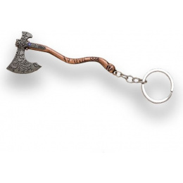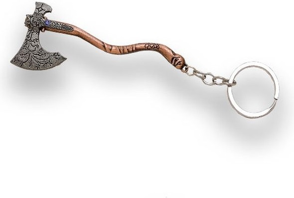 přívěsek na klíče ve tvaru sekery inspirované filmovanou ságou Lord of the Rings ornanentální ražba na čepeli s imitací drakohokamu kovová zdobená rukojeť závěsné oko řetízek s kroužkem pro možnost zavěšení