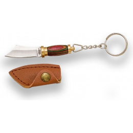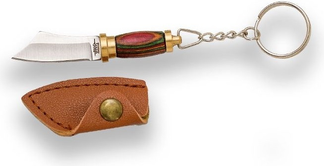 přívěsek na klíče ve tvaru jednosečného meče scimitar se zakřivenou čepelí dřevěná barevná oblá střenka závěsný otvor kožené pouzdérko na druk řetízek s kroužkem pro možnost zavěšeníVíce