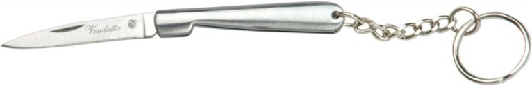 přívěšek na klíče s nápisem "Vendetta" na čepeli úzká štíhlá čepel z nerezové oceli leštěná stříbřitá střenka inox řetízek s kroužkem pro možnost zavěšení