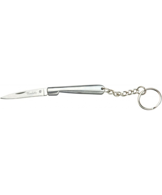 přívěšek na klíče s nápisem "Vendetta" na čepeli úzká štíhlá čepel z nerezové oceli leštěná stříbřitá střenka inox řetízek s kroužkem pro možnost zavěšeníVíce