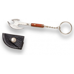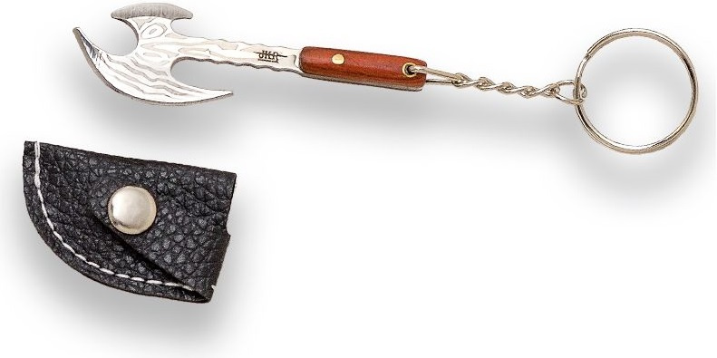 přívěsek na klíče ve tvaru vikingské sekery s čepelí s dvojitým ostřím v imitaci damaškové oceli dřevěná střenka s nýty závěsné oko koženkové pouzdérko na druk řetízek s kroužkem pro možnost zavěšeníVíce
