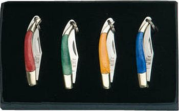 sada malých dárkových přívěsků ve tvaru zavíracího nože čepel z nerezové oceli inox s nehetníkem je ostře nabroušena barevná střenka v kombinaci mosaz a leštěný plast micarta kroužek pro zavěšení o průměru 8 mm každá sada obsahuje čtyří různé barevné varianty přívěsku baleno v černém dárkovém boxu opatřeném ochranným molitanemVíce
