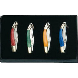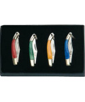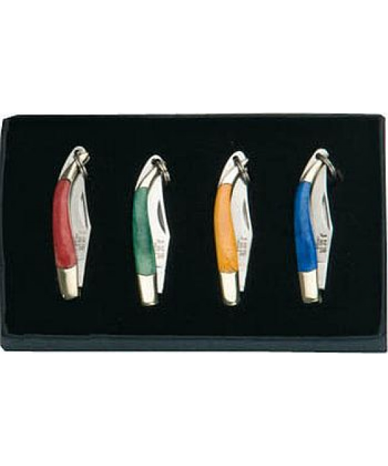 sada malých dárkových přívěsků ve tvaru zavíracího nože čepel z nerezové oceli inox s nehetníkem je ostře nabroušena barevná střenka v kombinaci mosaz a leštěný plast micarta kroužek pro zavěšení o průměru 8 mm každá sada obsahuje čtyří různé barevné varianty přívěsku baleno v černém dárkovém boxu opatřeném ochranným molitanem