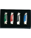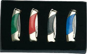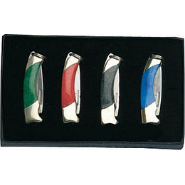 sada malých dárkových přívěsků ve tvaru zavíracího nože čepel z nerezové oceli inox s nehetníkem je ostře nabroušena barevná střenka v kombinaci mosaz a leštěný plast micarta kroužek pro zavěšení o průměru 8 mm každá sada obsahuje čtyří různé barevné varianty přívěsku baleno v černém dárkovém boxu opatřeném ochranným molitanem