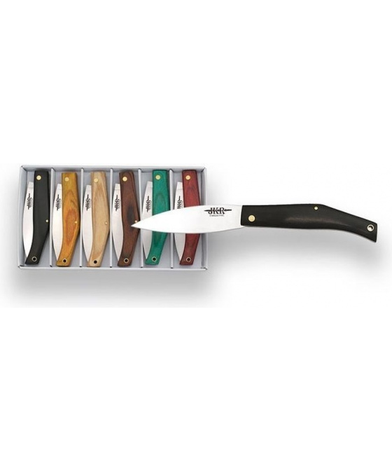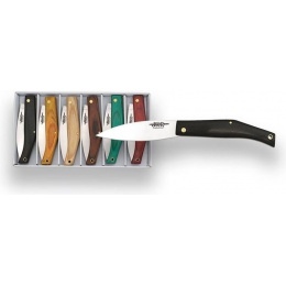sada šesti dárkových přívěsků ve tvaru malého zavíracího nože čepel typu drop point o délce 6 cm z nerezové oceli se saténovým povlakem různá barevná provedení nýtovaných střenek z lisovaného dřeva součástí přívěsků je závěsný kovový řetízek neobsahuje pojistkuVíce