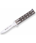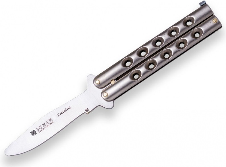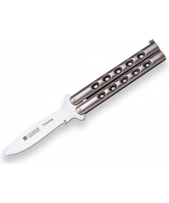 masivní nůž typu motýlek s odlehčovacími otvory stříbrná střenka z materiálu zamak jištěná západkou tréninková čepel bez ostří