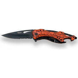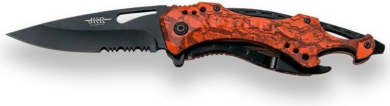 záchranářský nerezový nůž černěná částečně ozubená nerezová čepel typu drop point ovladatelná jednou rukou pomocí otvoru na čepeli pojistka typu liner lock střenka z aluminia ve střence je integrovaný tvrzený úderník na rozbíjení automobilových skel otvírák na lahve v spodní části otvor pro upevnění šňůrky nebo karabiny ocelový klip na opasekVíce