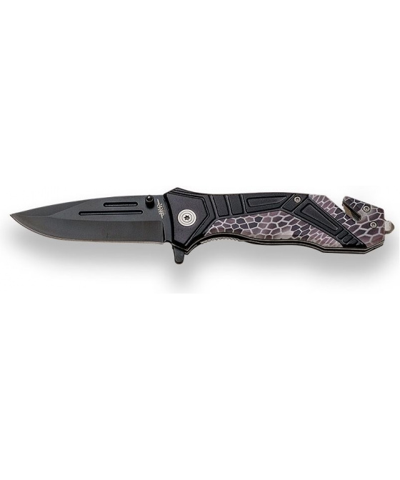 záchranářský nerezový nůž černěná nerezová čepel typu clip point ovladatelná jednou rukou pomocí kolíčku na čepeli nebo spodního flipperu pojistka typu liner lock střenka z aluminia ve střence je integrováno kryté ostří na přeřezávání bezpečnostních pásů a tvrzený úderník na rozbíjení automobilových skel ocelový klip na opasekVíce