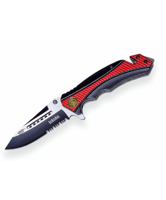 -taktický záchranářský nerezový nůž -černěná částečně ozubená nerezová čepel ovladatelná jednou rukou díky kolíčku na čepeli -odlehčovací otvory na čepeli -pružinová pojistka -aluminiová střenka s nápisem motivem "Police" -ve střence je integrováno kryté ostří na přeřezávání bezpečnostních pásů a tvrzený úderník na rozbíjení automobilových skel -ocelový klip na opasek -nylonové pouzdro pro možnost vertikálního i horizontálního upevnění k opasku