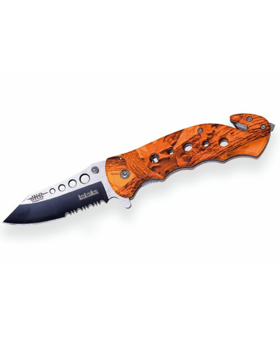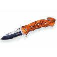 -záchranářský nerezový nůž -černěná částečně ozubená nerezová čepel s lehčovacími otvory -pružinová pojistka -oranžová aluminiová střenka s odlehčovacími otvory a plastovým krytem -ve střence je integrováno kryté ostří na přeřezávání bezpečnostních pásů a tvrzený úderník na rozbíjení automobilových skel -ocelový klip na opasek -kordurové pouzdro s plastovým klipem a poutkem na opasek