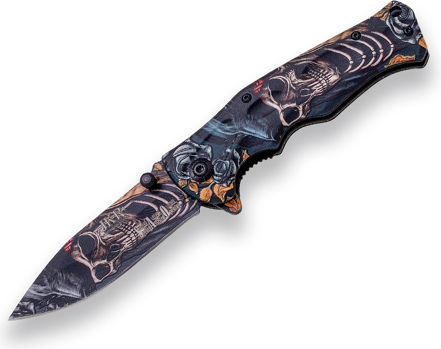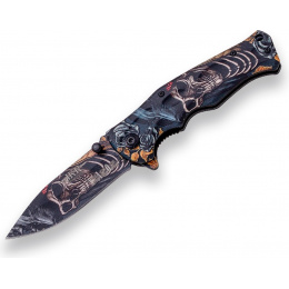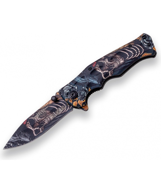 kapesní nůž se sklopnou nerezovou čepelí typu drop point černěná povrchová úprava ozdobné čepele ergonomicky tvarovaná střenka z aluminia s motivem kostlivce pohyb čepele pomocí kolíčku na čepeli nebo flipperu (ploutve), po otevření slouží jako záštita zabraňující sklouznutí prstů na čepel nože pružinová pojistka typu line-lock zabraňující náhlému sklopení čepele během používání nože ocelový klip na opasek otvor pro upevnění šňůrkyVíce