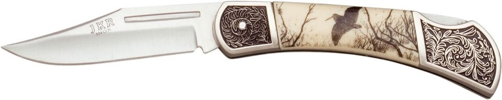 kapesní nůž se sklopnou nerezovou čepelí a ozdobným motivem leštěná střenka v kombinaci aluminium a plast s vyobrazením bekasíny čepel typu clip point ovladatelná jednou rukou pomocí nehetníku hřbetní pojistka zabraňující sklopení čepele během používání nožeVíce
