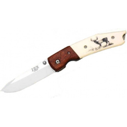 nůž se sklopnou čepelí a motivem jelena leštěná střenka s vyobrazením jelenana každé straně jednou rukou ovladatelná čepel čepel jištěná pojistkou liner lockVíce