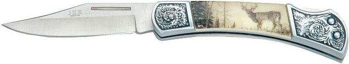 nůž se sklopnou čepelí a ozdobným motivem leštěná střenka s vyobrazením jelena čepel s nehetníkem čepel jištěná pojistkouVíce