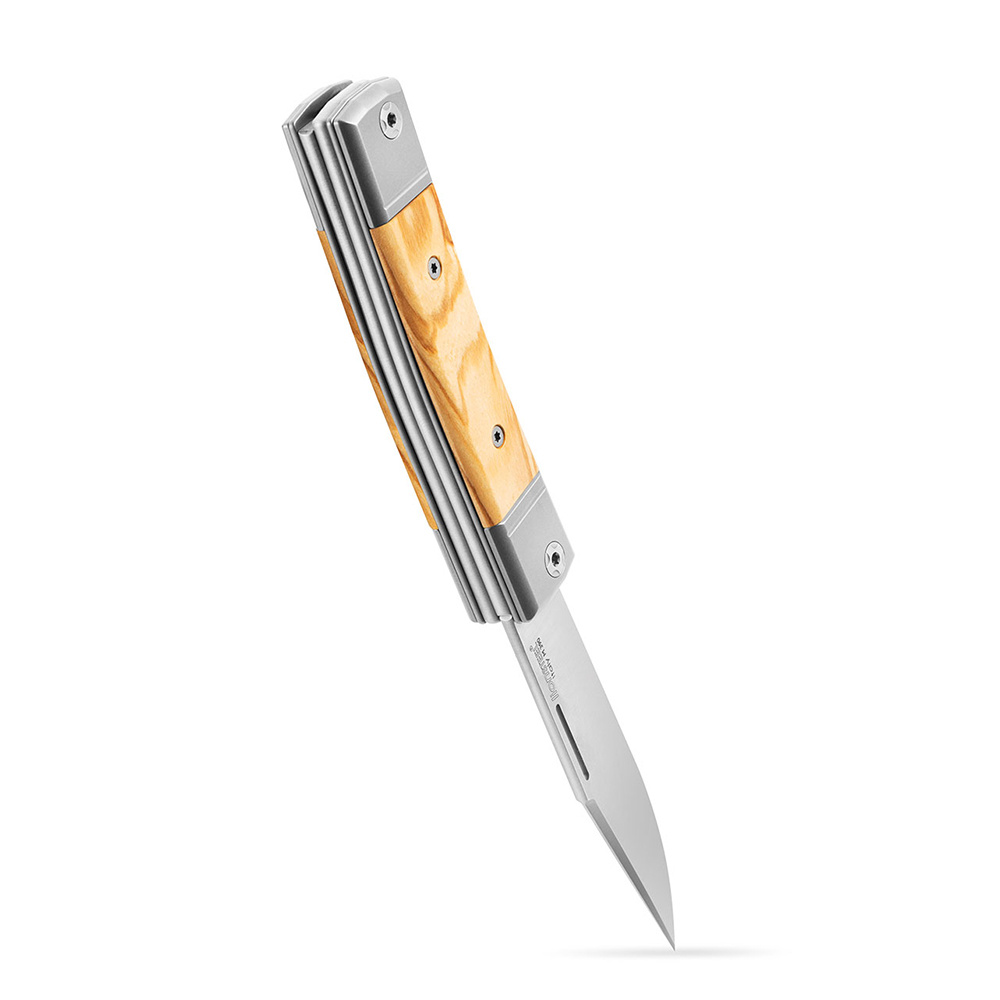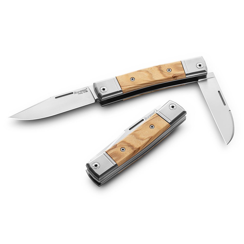 BestMAN s dvojicí čepelí z ocele M390 a rukojetí z olivového dřeva.