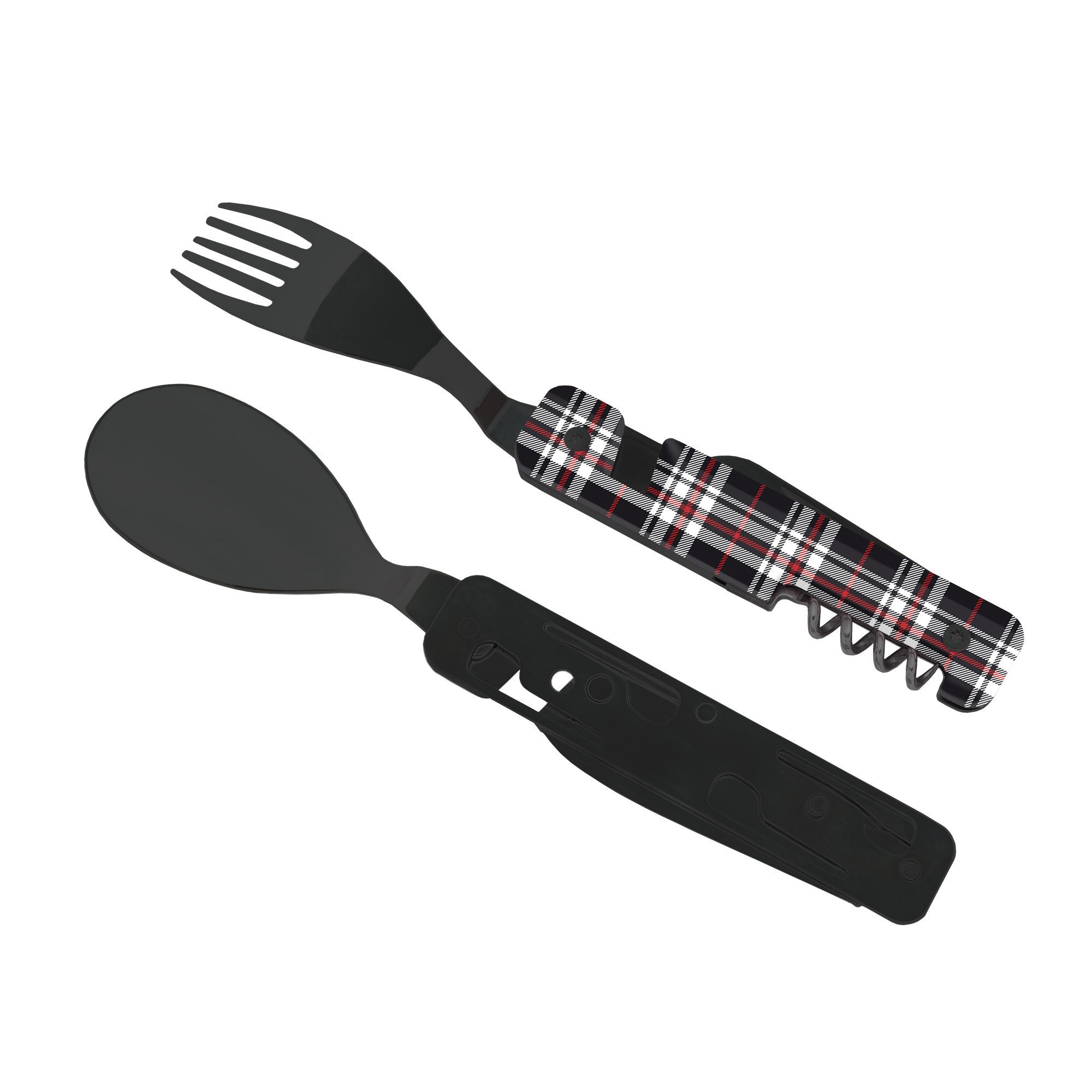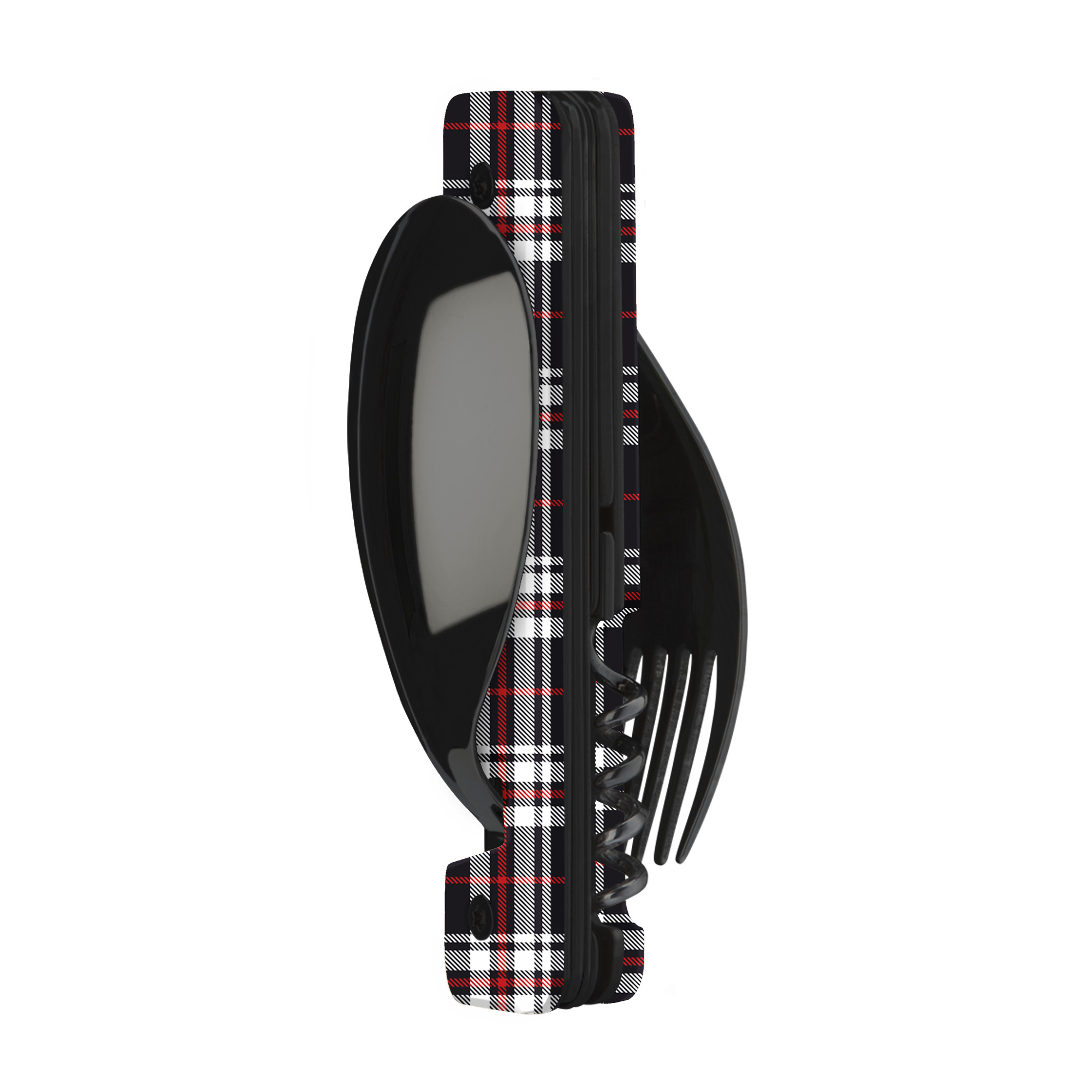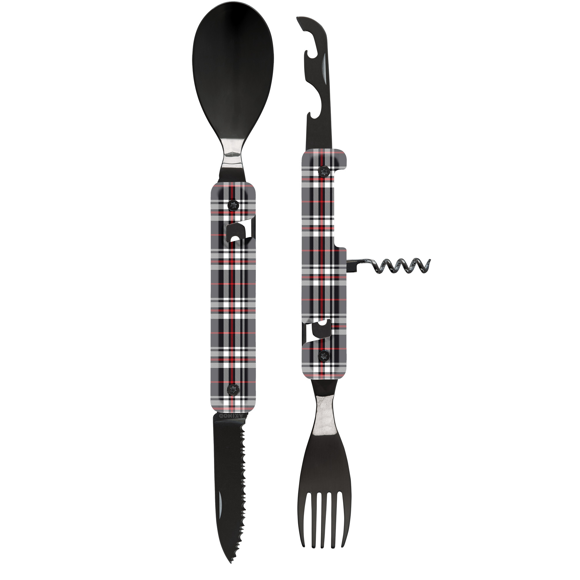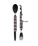 Cestovatelský příborový set s vývrtkou v moderním designu s grafikou blue tartan.
