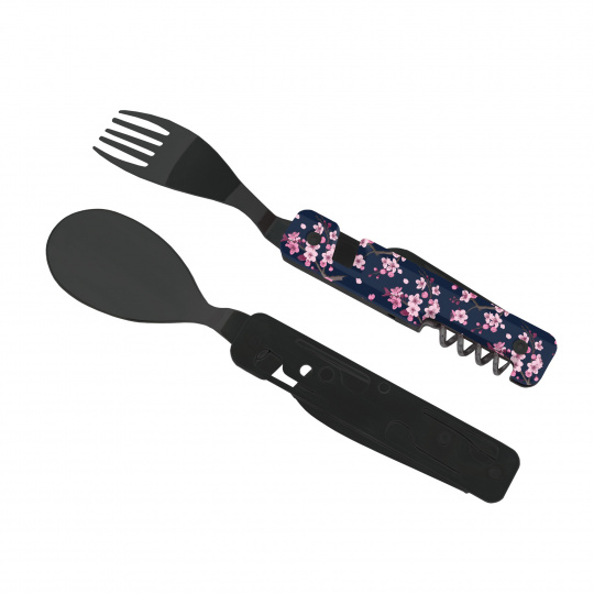 Cestovatelský příborový set s vývrtkou v moderním designu s grafikou Cherry blossom.