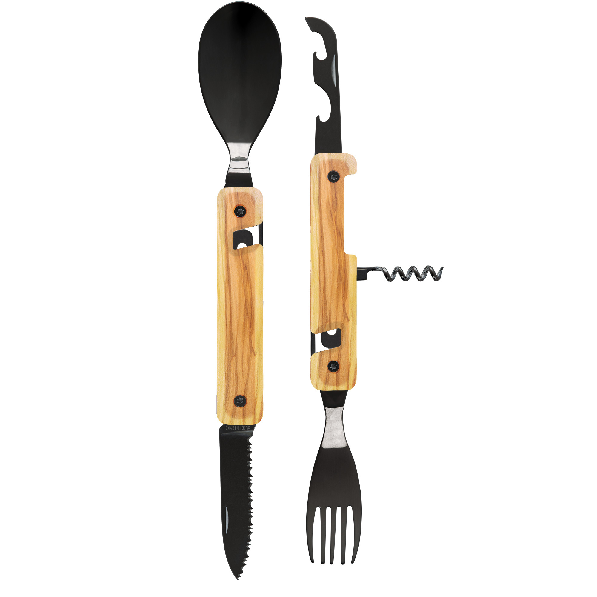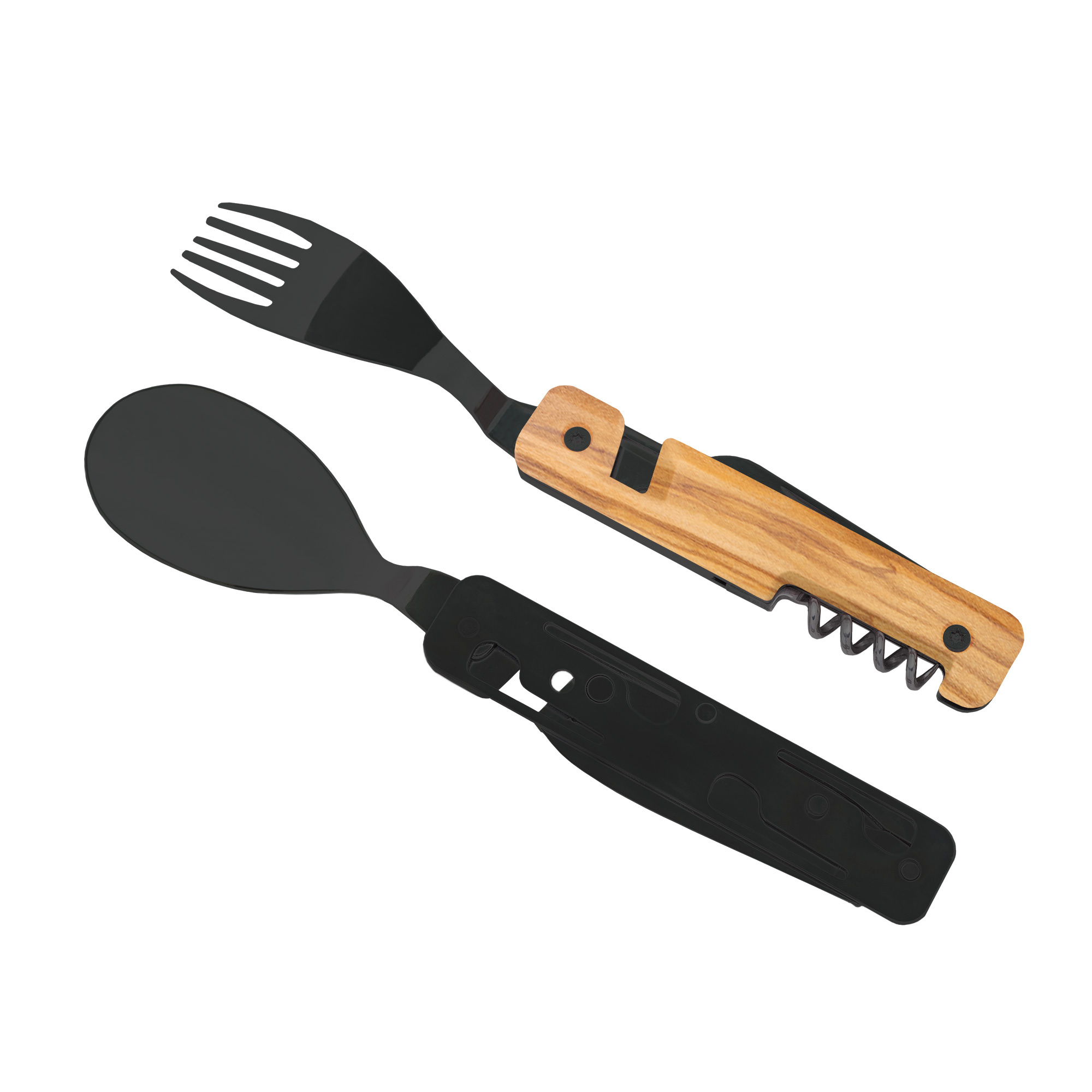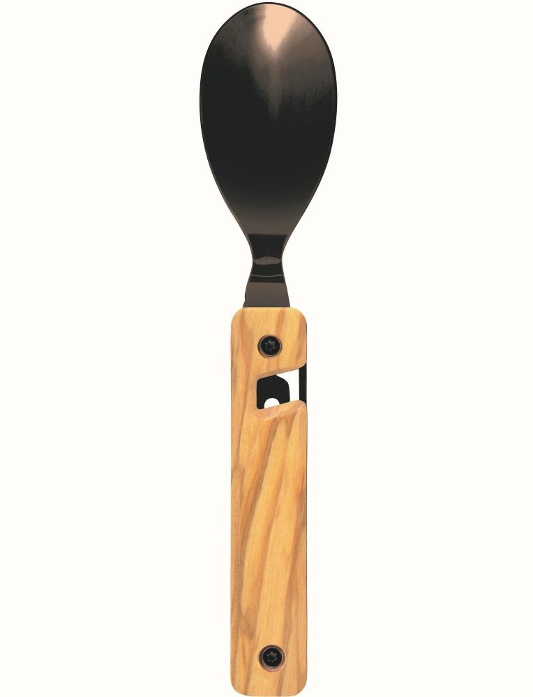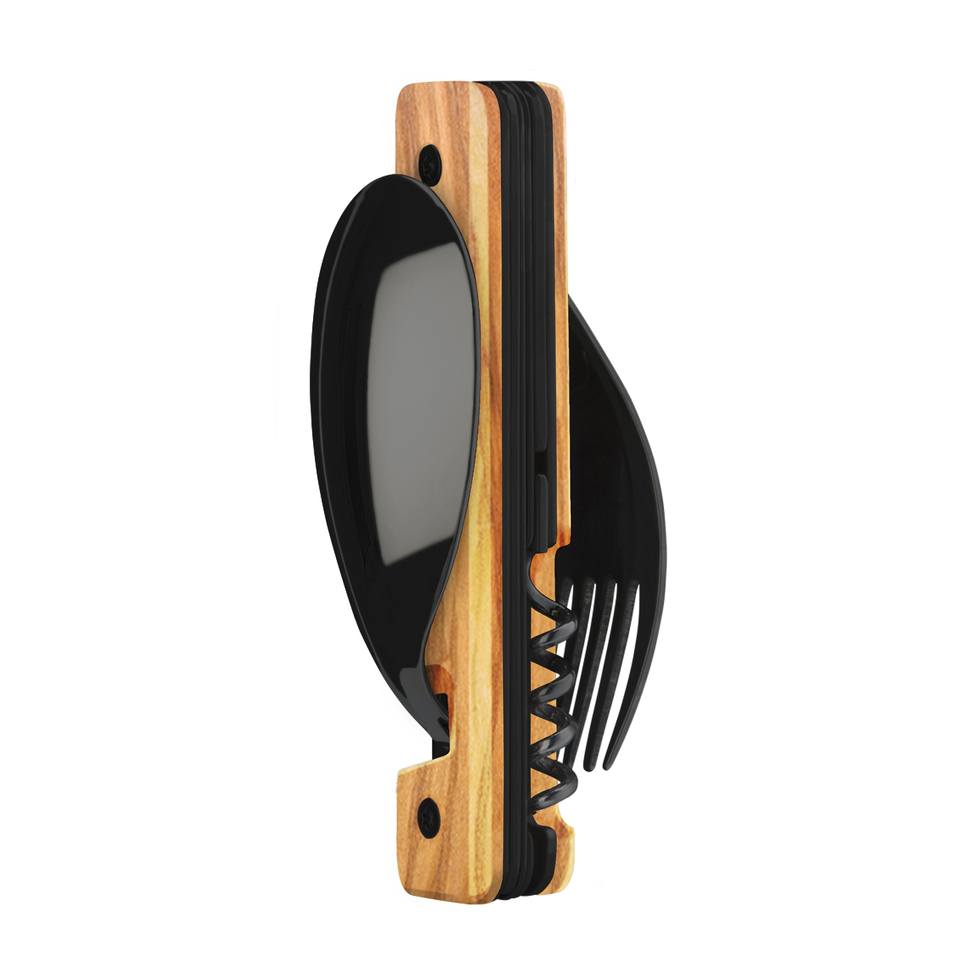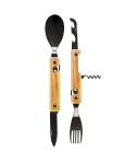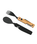 Cestovatelský příborový set s vývrtkou v moderním designu s rukojetí z olivového dřeva.