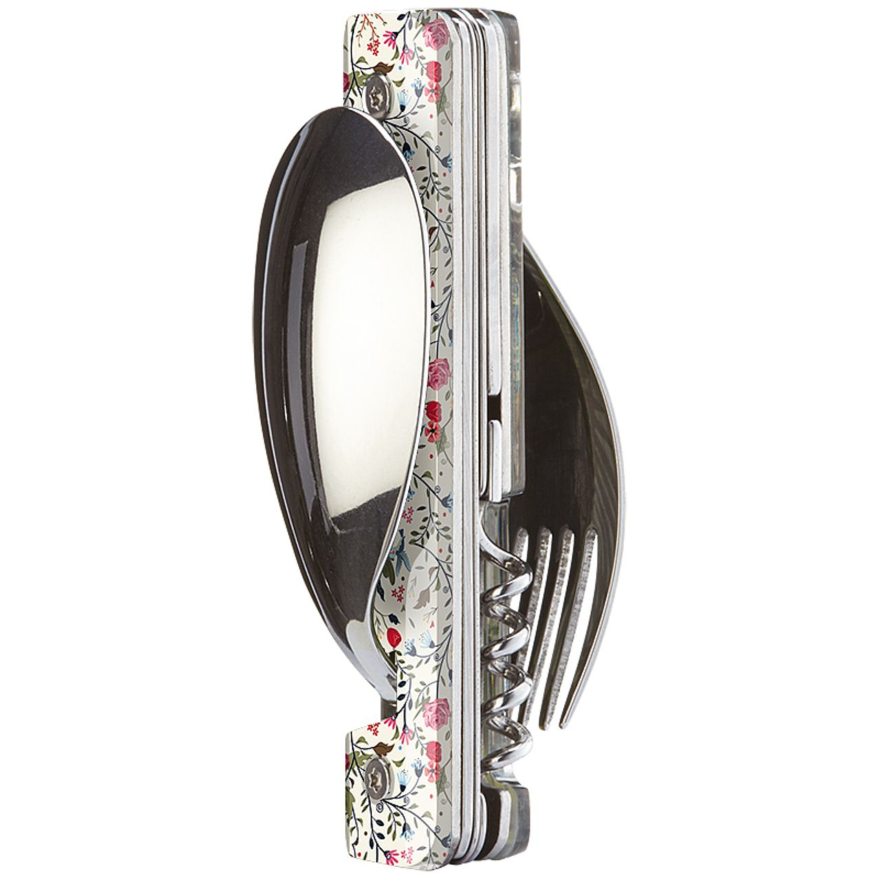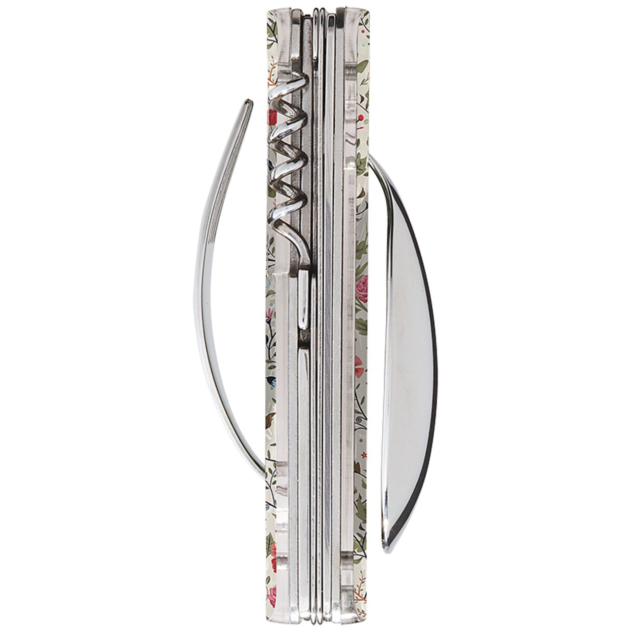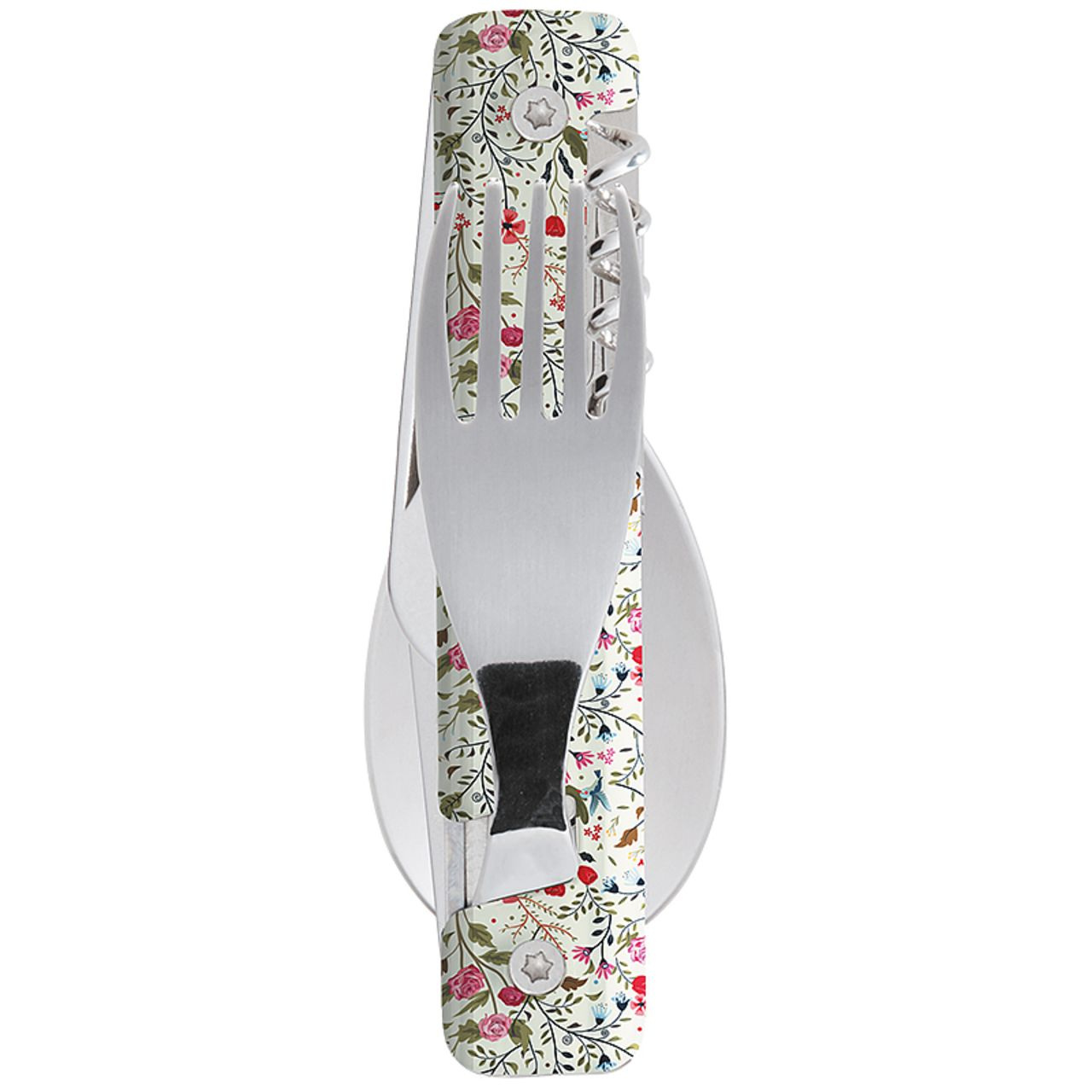Cestovatelský příborový set s vývrtkou v moderním designu s vyobrazením květinové louky.