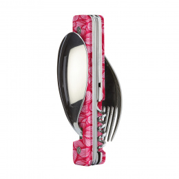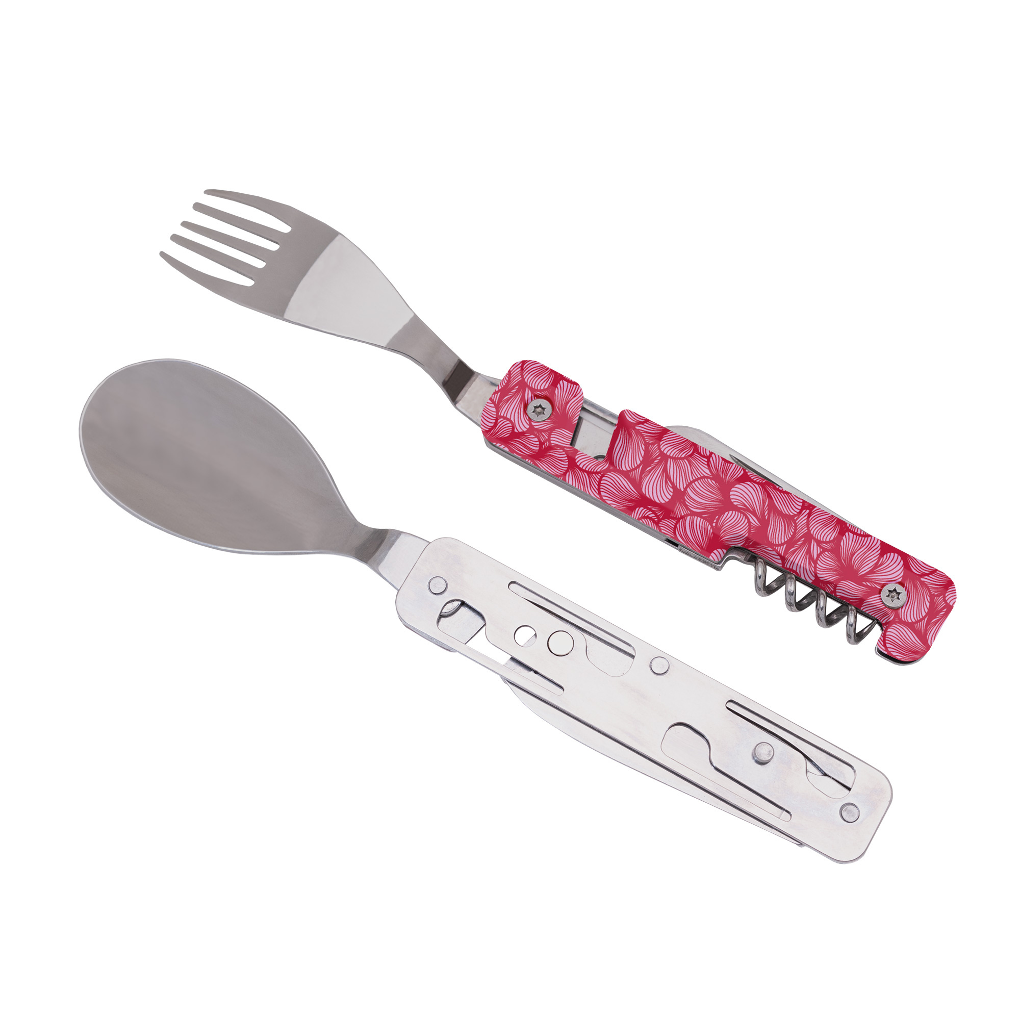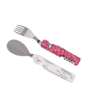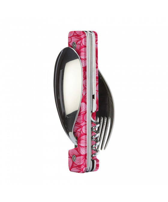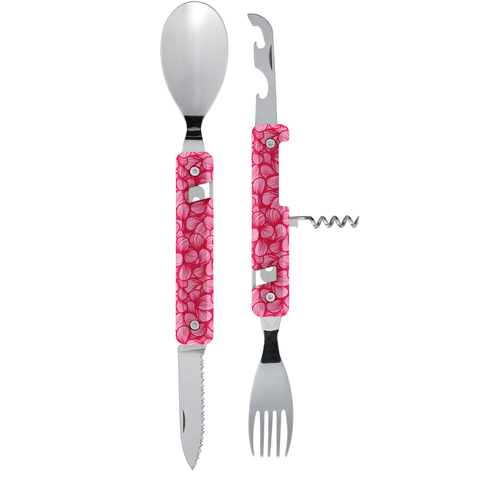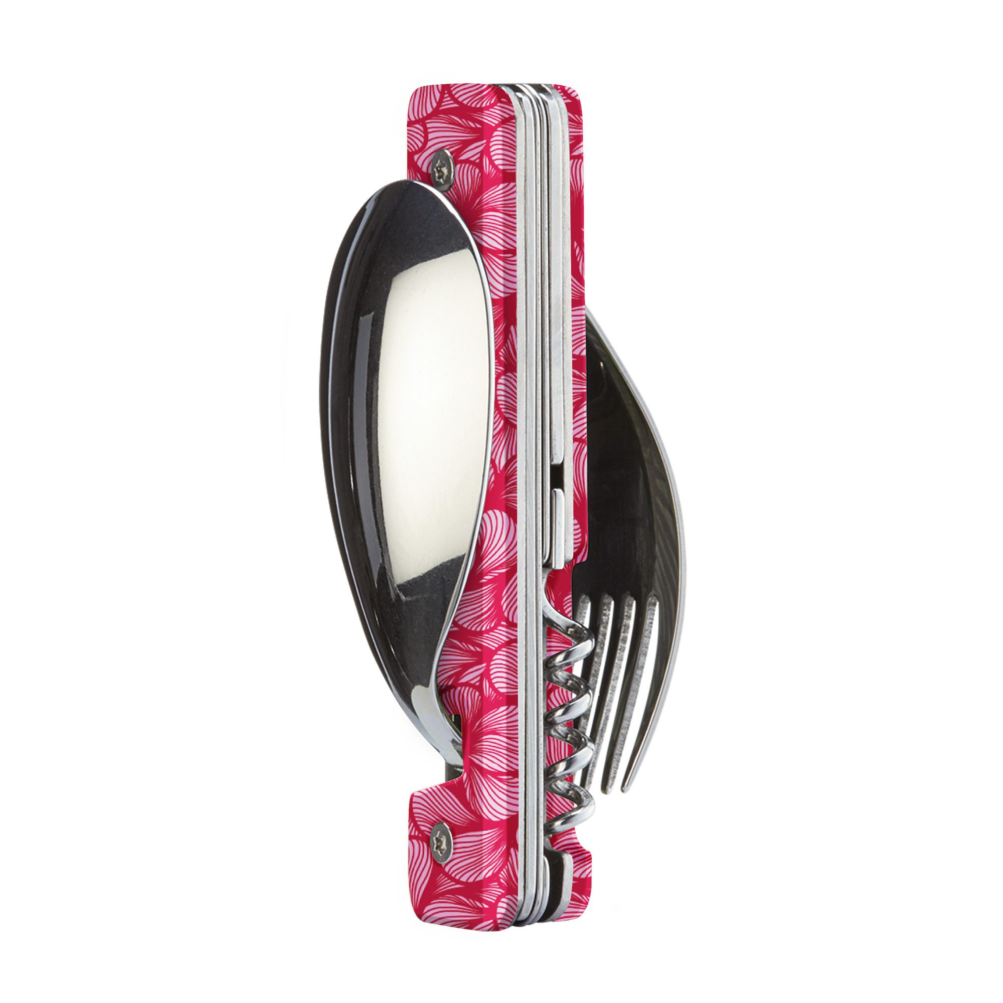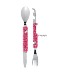 Cestovatelský příborový set s vývrtkou v moderním designu s novou grafikou jemně růžové barvy.