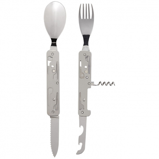 nůž se zubatým ostřím, vidlička, lžička, vývrtka, otvírák plechovek, otvírák korunkových uzávěrů lahví