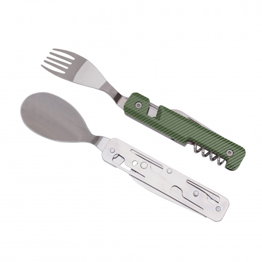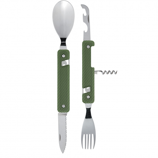 Cestovatelský příborový set v moderním designu s eloxovanou rukojetí zelené barvy.