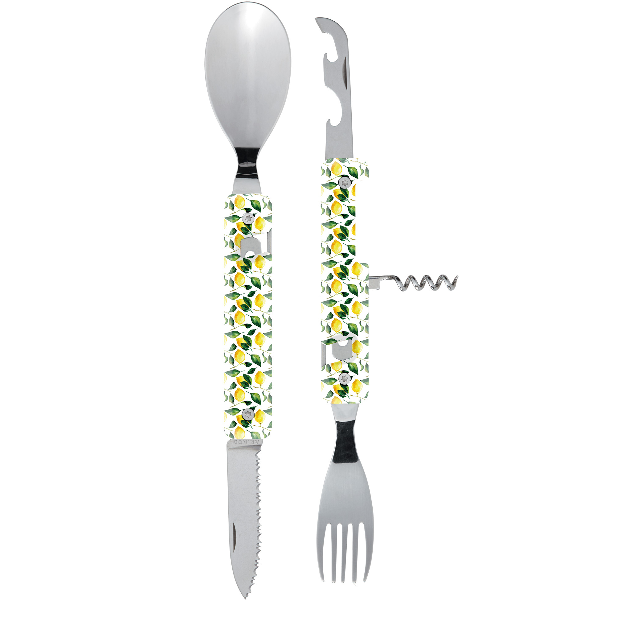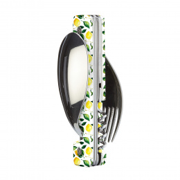 Cestovatelský příborový set s vývrtkou v moderním designu s populárním vzorem citronů.